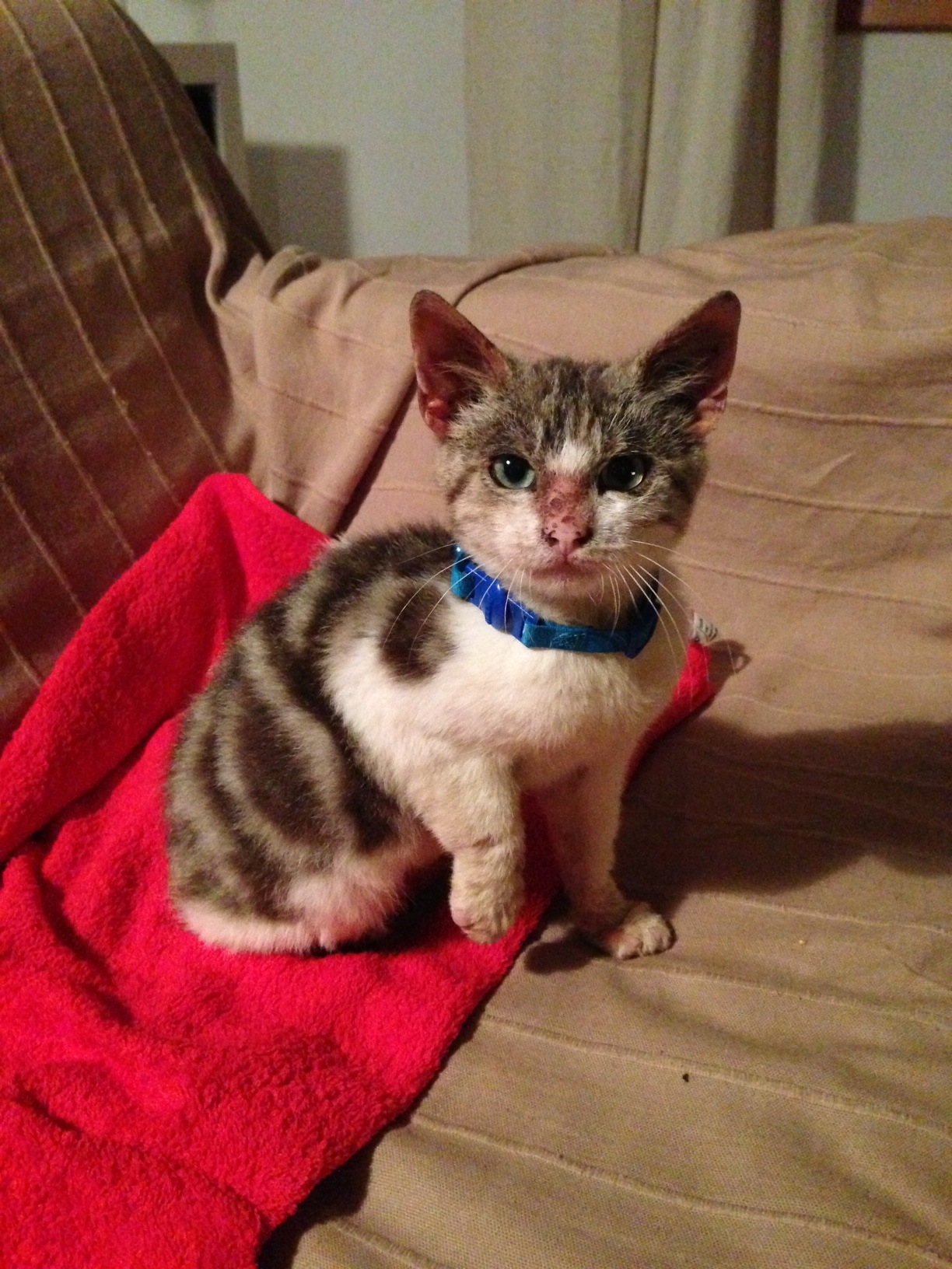 Let me start by saying that I am not a cat person. However, when we went to see the kitten — temporarily named Cat-Rat — I suddenly developed a soft spot for this pathetic, sickly looking thing. I decided that it would be a good idea to bring this kitten home, take care of it (we didn’t know if it was a boy or a girl), and get it healthy. I thought that he or she would be a good companion while we were apart. So we brought it home, bought cat shampoo and a few pairs of rubber gloves, and attempted to give Cat-Rat a bath. It was a nightmare — scratches, bites, and lots of hissing later, Cat-Rat was cleaner, but still not clean.